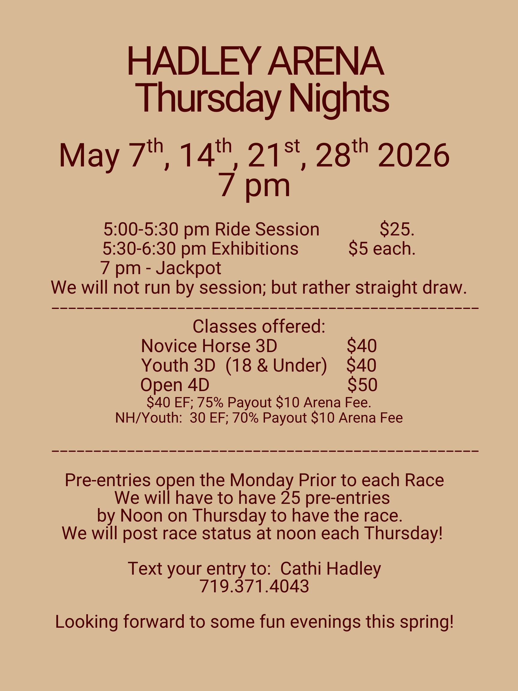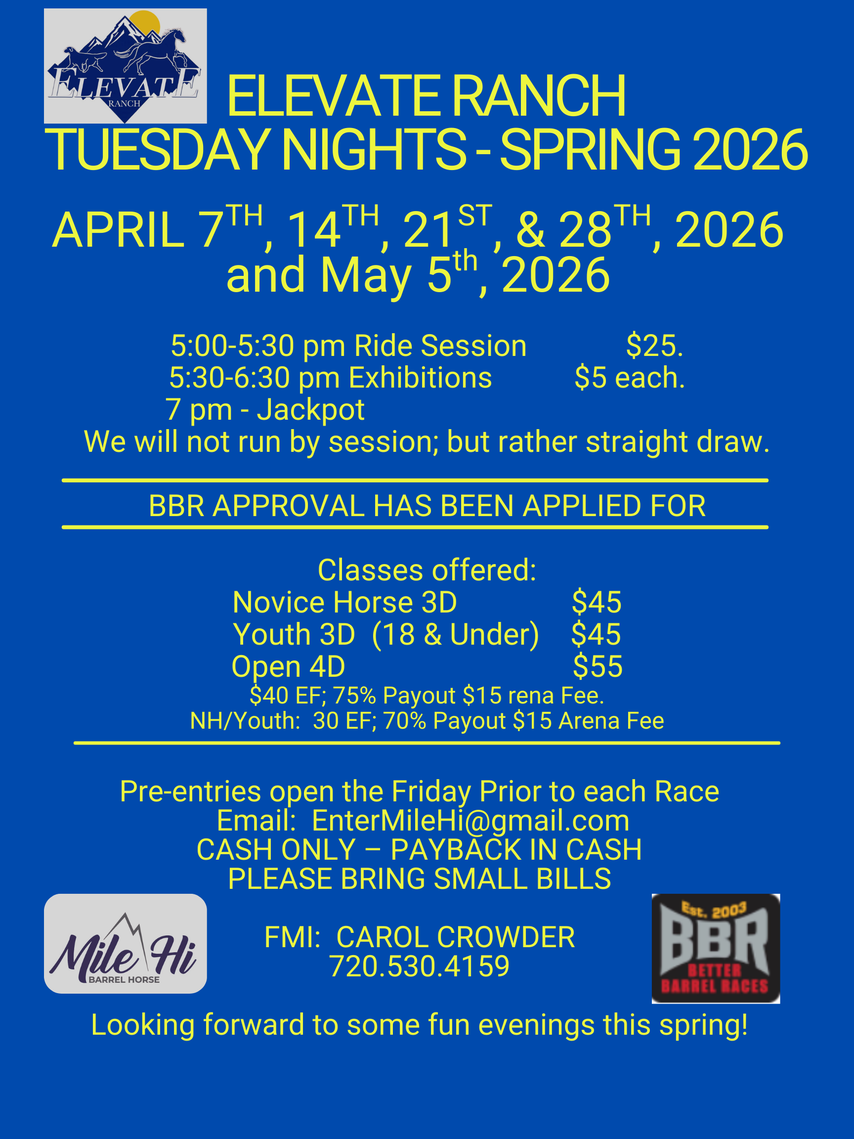 Weekly Barrel Racing Events Below are our upcoming weekly races:Tuesdays at Elevate Ranch - April 2026 all are BBR Approved!Then Thursdays in Canon City - May 2026Save the dates and try to attend for some evening fun!